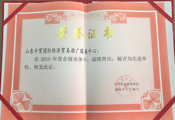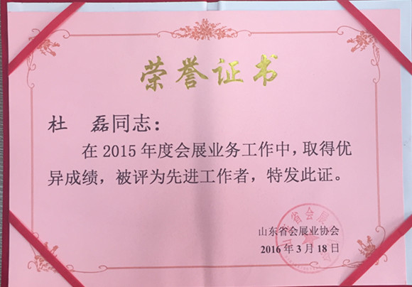 2015年度山東會(huì)展行業(yè)先進(jìn)單位。 記者 李曉夢(mèng)/攝