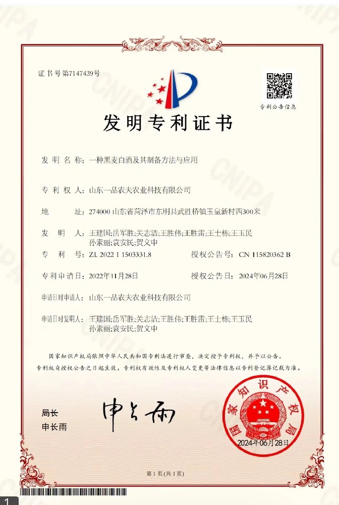 近日,山東一品農(nóng)夫農(nóng)業(yè)科技有限公司“一種黑麥白酒及其制備方法與應(yīng)用”發(fā)明專利獲批(專利號:ZL 2022 1 1503331.8),該公司也成為白酒行業(yè)首家以黑···